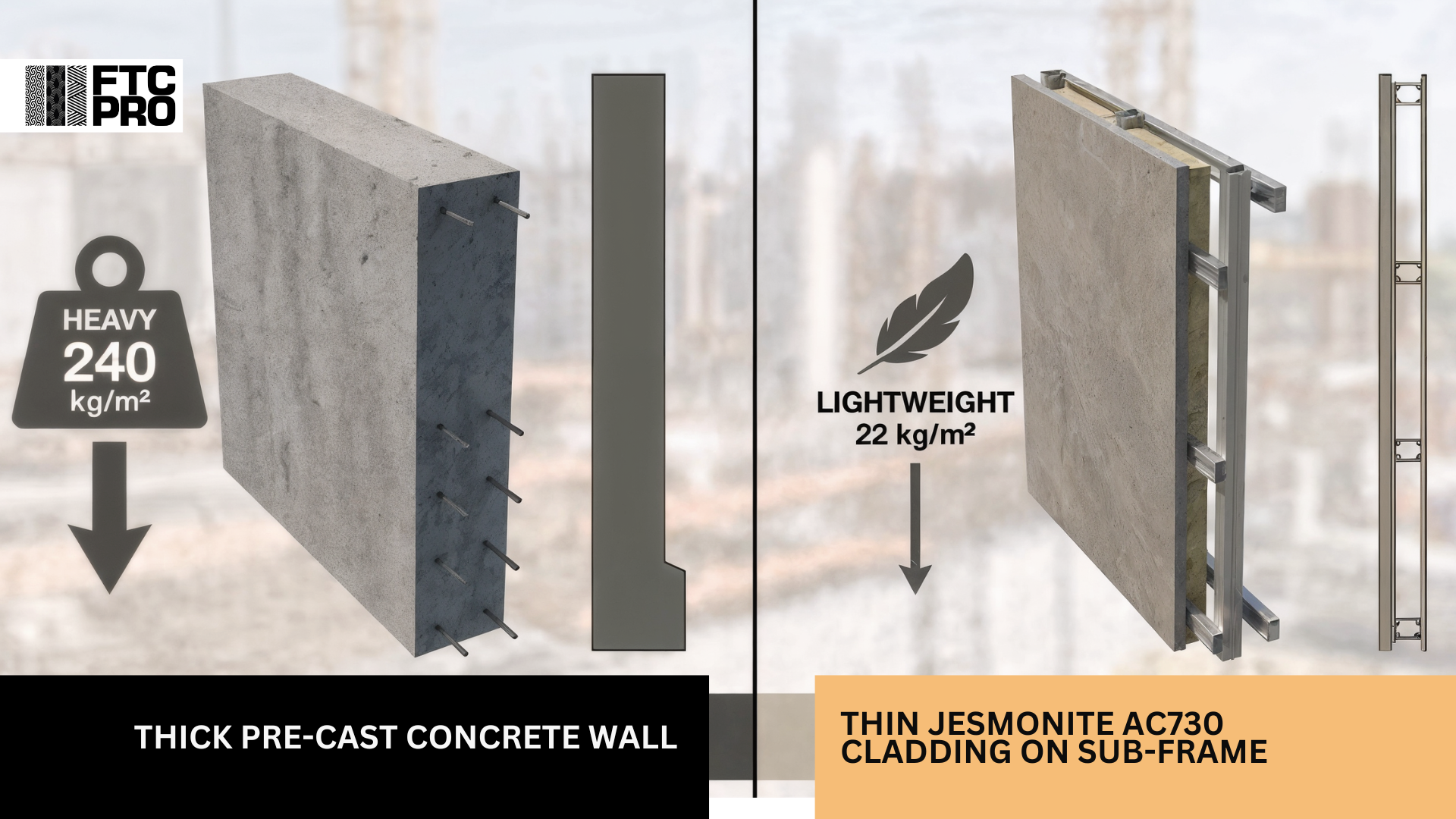When evaluating cladding materials for a facade specification, architects and engineers need clear, comparable data — not vague qualitative terms. The table below summarises how AC730 Micro-Concrete performs against the two most common traditional systems, using verified figures from the Jesmonite AC730 TDS and the GRCA Specification.