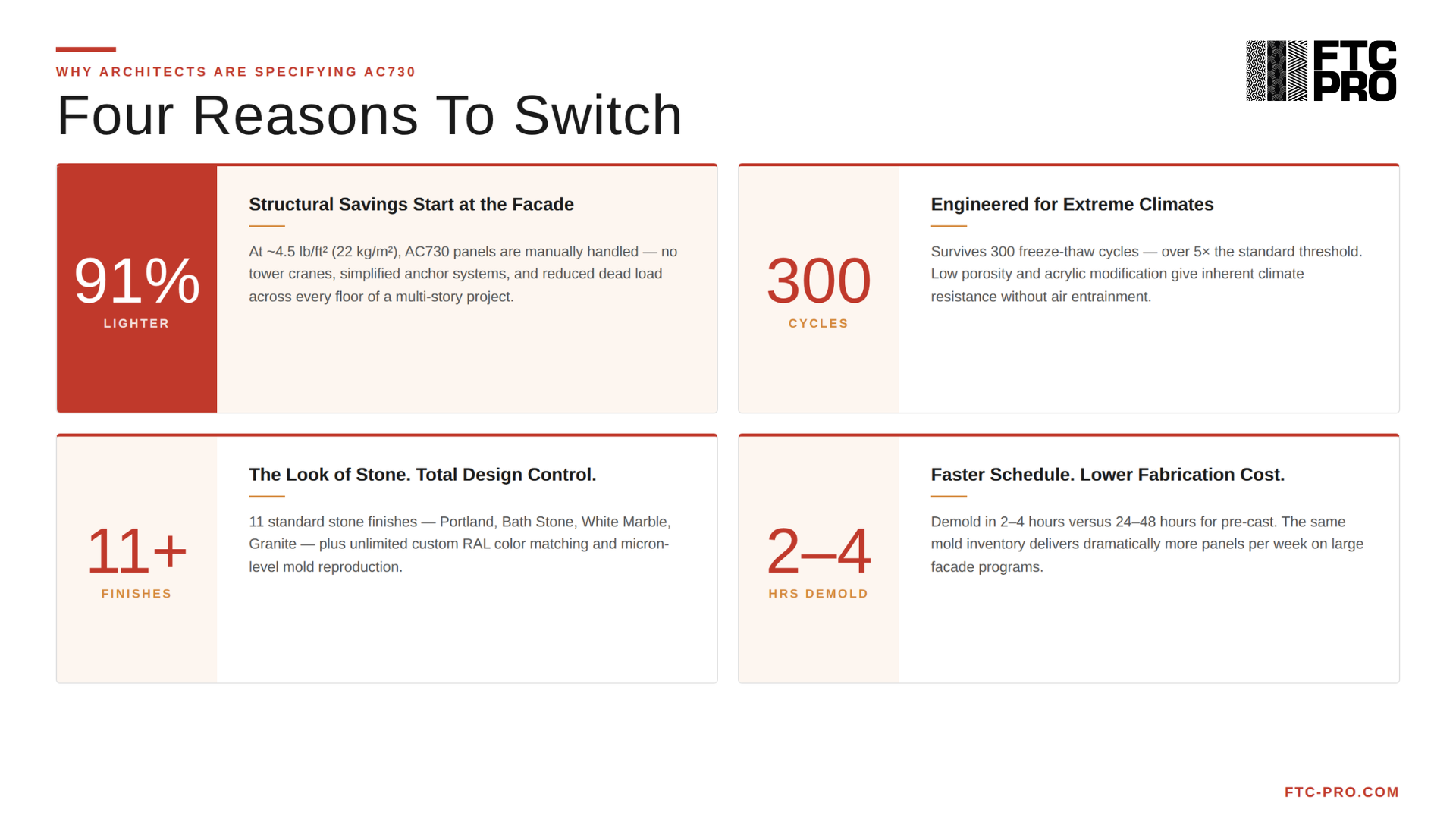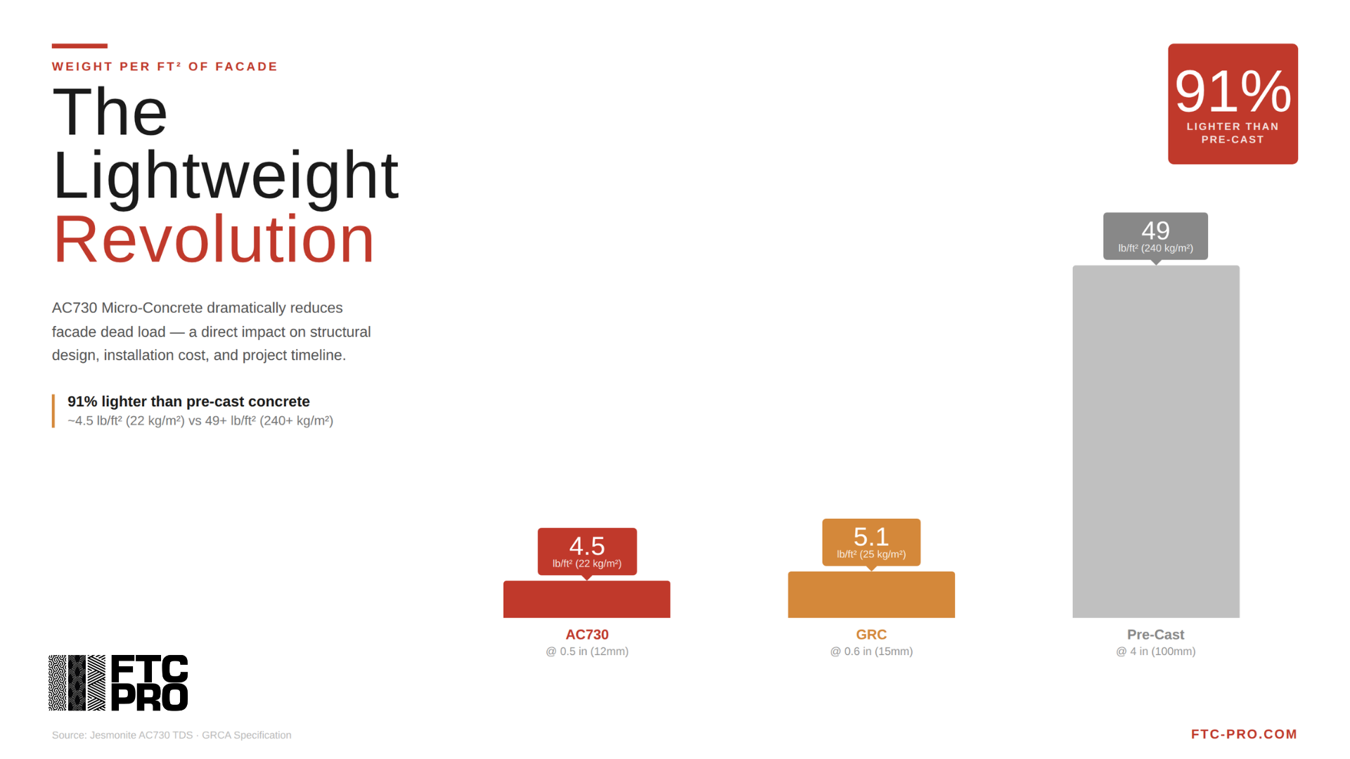AC730 and GRC have very similar densities (115 vs 112 lb/ft³ (1,850 vs 1,800 kg/m³)). The weight advantage of AC730 comes from the ability to cast thinner panels with adequate structural performance. The substantial weight saving — up to 91% — is primarily against conventional pre-cast concrete (150 lb/ft³ (2,400 kg/m³) at 2–6 in (50–150mm) thickness).