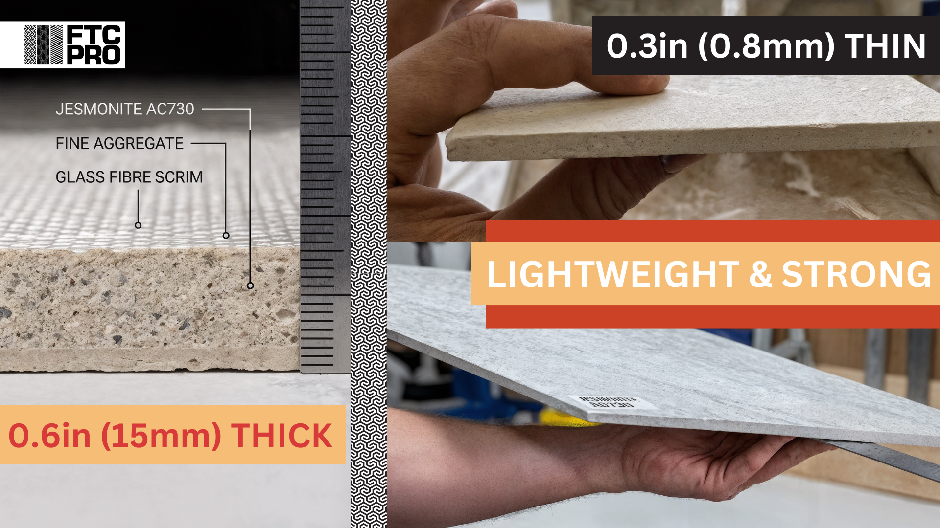 AC730 Micro-Concrete changes that equation entirely. Developed by Jesmonite® — a UK-based innovator with over 40 years in advanced composite materials — AC730 is not a resin or a thin-film coating. It is a genuine cementitious composite that retains the tactile ruggedness and mineral character of stone, while stripping away the punishing weight and logistical complexity that have defined concrete cladding for generations. Distributed exclusively in the United States by FTC Pro, AC730 is now available to US architects, fabricators, and specifiers with stateside inventory.